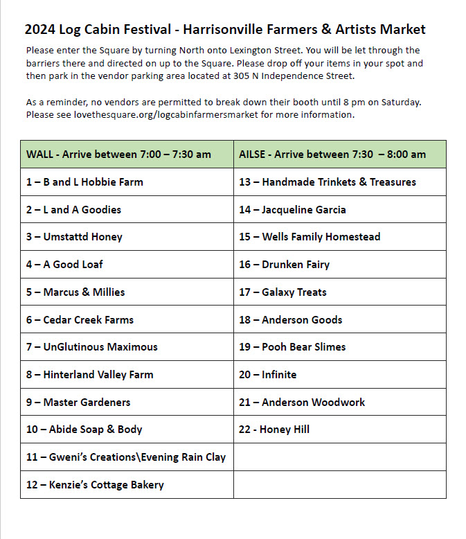As a benefit to vendors who have participated in the current Market Season, they can qualify to be part of the Special Farmers Market that takes place on the Saturday of the Log Cabin Festival. The Log Cabin Festival and the Special Farmers Market take place the first Saturday of October each year. In 2024, this will be October 5th.